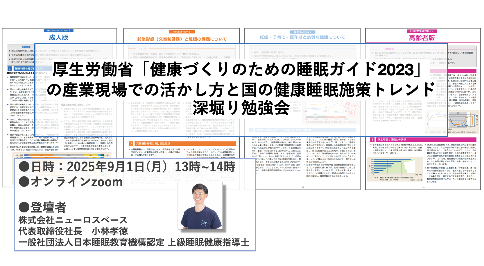 今回の深堀り勉強会では、睡眠ガイド2023の成人版、交替制勤務版、高齢者版、そして女性の健康版を包括して、産業現場で働くビジネスパーソンを全て網羅した内容で解説をさせて頂きます。
