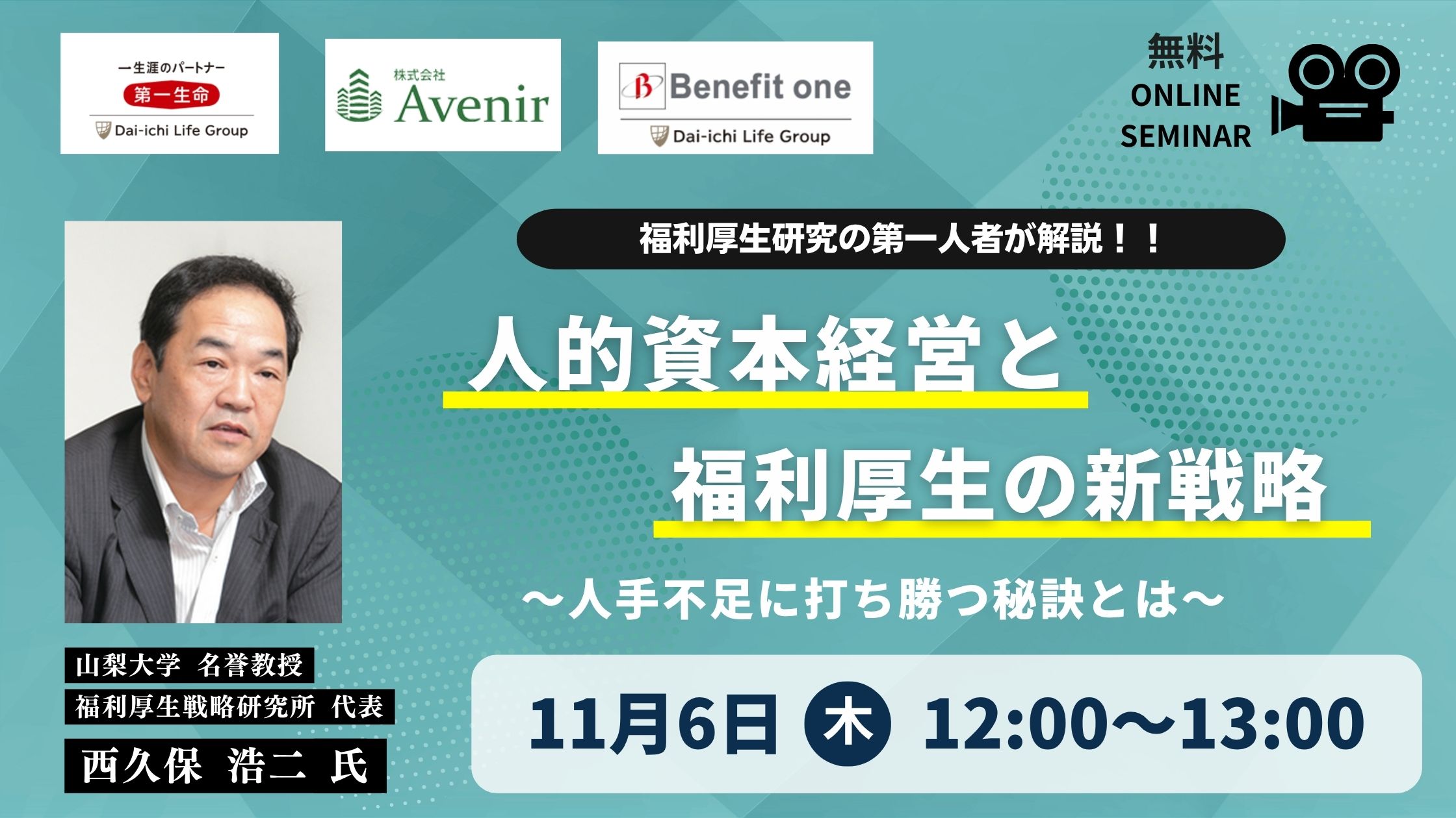 本セミナーでは、福利厚生研究の第一人者であり山梨大学名誉教授、福利厚生戦略研究所 代表である西久保浩二氏をお迎えし