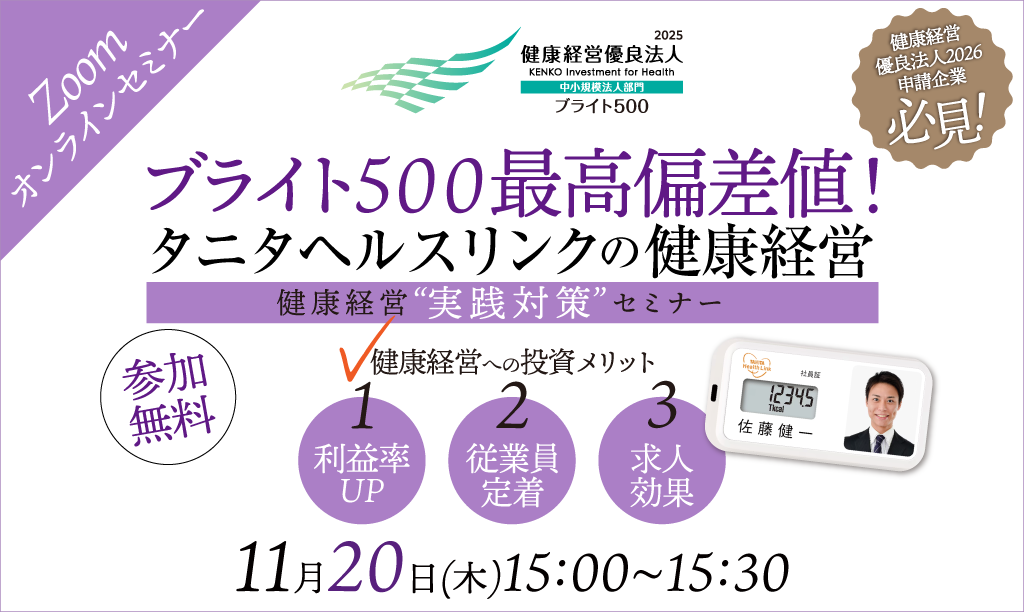 本セミナーでは健康経営情報や、弊社にお問合せが多い「健康経営の進め方」、「社員全体で取り組む健康づくり」について、弊社の健康経営の実例をふまえながらお伝えします。